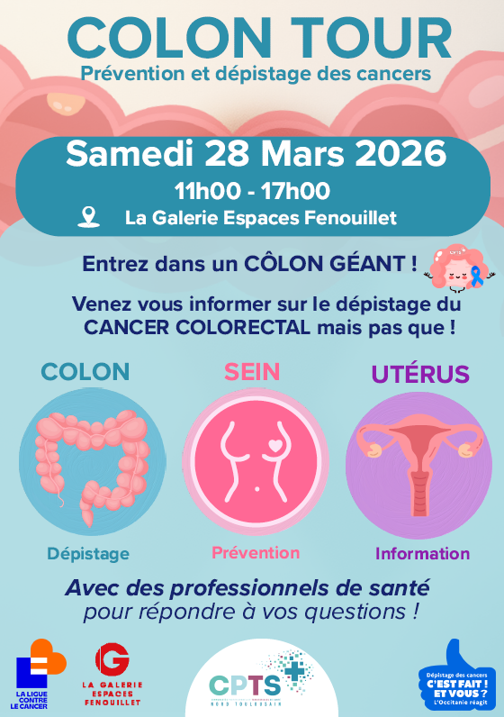 Le samedi 28 mars 2026, ne manquez pas le CÔLON TOUR 2026, une journée dédiées à la prévention et au dépistage de trois cancers majeurs : le cancer colorectal, le cancer du sein et le cancer du col de l'utérus.